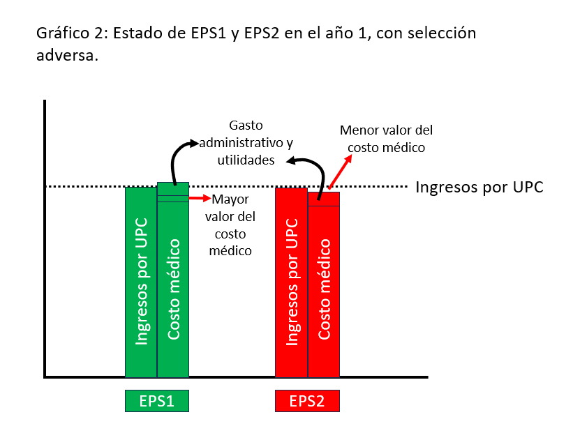Pero recordemos que hay libertad de elección. Entonces los pacientes con condiciones médicas de alto costo prefieren la EPS1 porque les da mejor servicio. Esto lleva a que la EPS1 tenga una selección adversa y su costo médico será superior al promedio. Claro, la EPS2 se beneficiará del efecto opuesto: tendrá menos pacientes de alto costo y su costo médico será inferior al promedio.