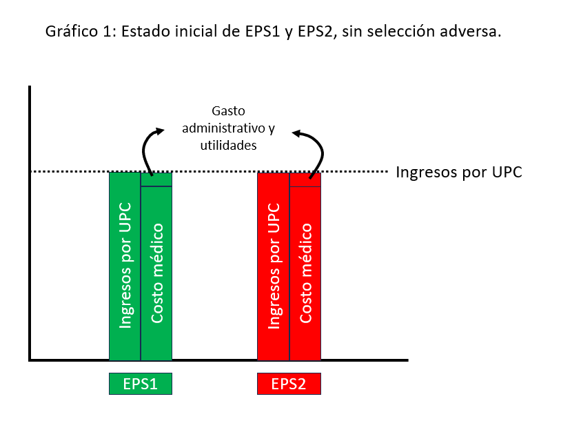 Volviendo al argumento, asumamos que la UPC está perfectamente bien calculada y que es suficiente. Eso no es cierto, pero lo asumimos, para separar el problema de suficiencia de UPC, del problema de selección adversa. Supongamos ahora: 1) que hay 2 EPS, 2) que hay 10 millones de afiliados entre las dos EPS, cada una con 5.000.000 de afiliados, y 3) que la UPC es de $1.000.000. Si la población de 10 millones se distribuyera totalmente al azar entre las dos EPS, es decir, sin selección adversa, no habría ningún desequilibrio en el costo médico de ambas.